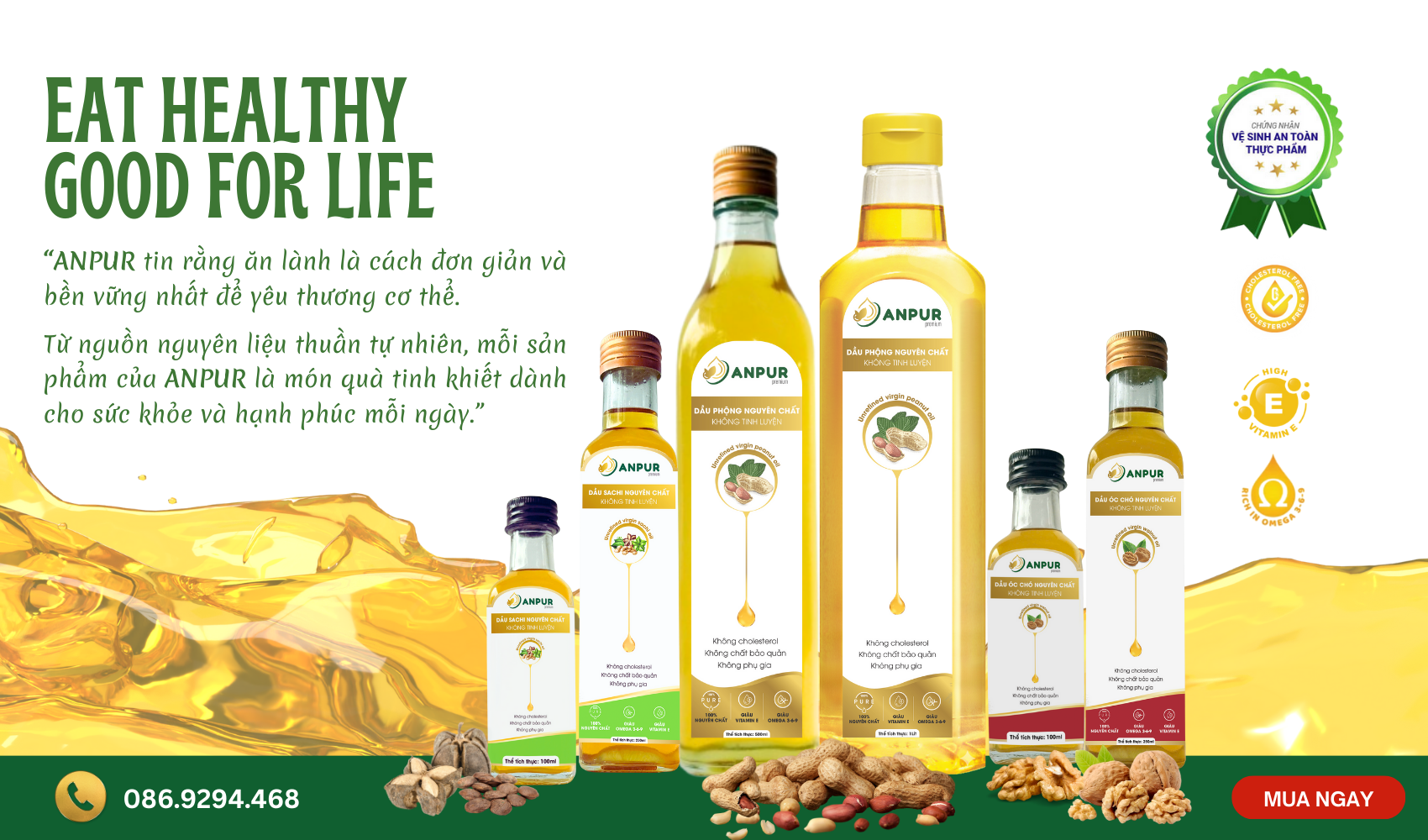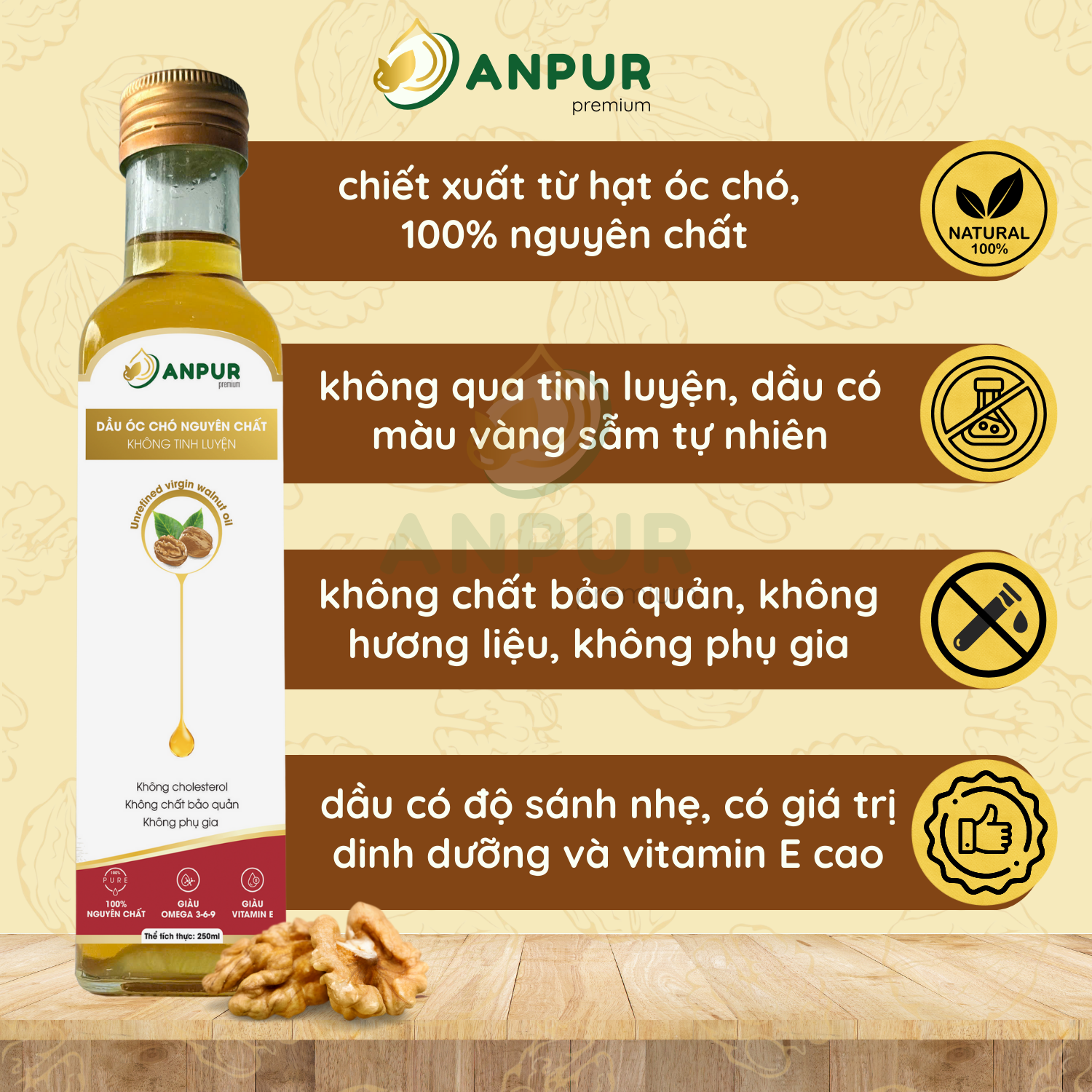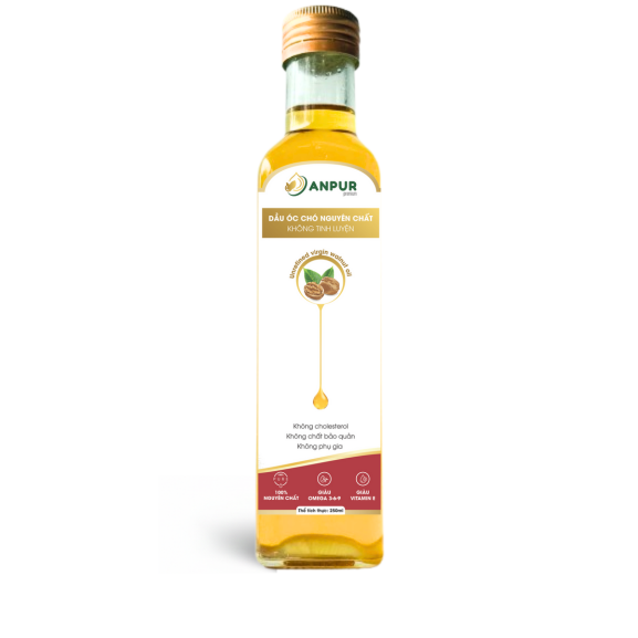 Dầu óc chó giàu axit béo tốt, được sản xuất theo quy trình ép dầu ở nhiệt độ thấp không tinh luyện để bảo toàn dưỡng chất. Thích hợp dùng nguội, trộn salad và bổ sung dinh dưỡng.