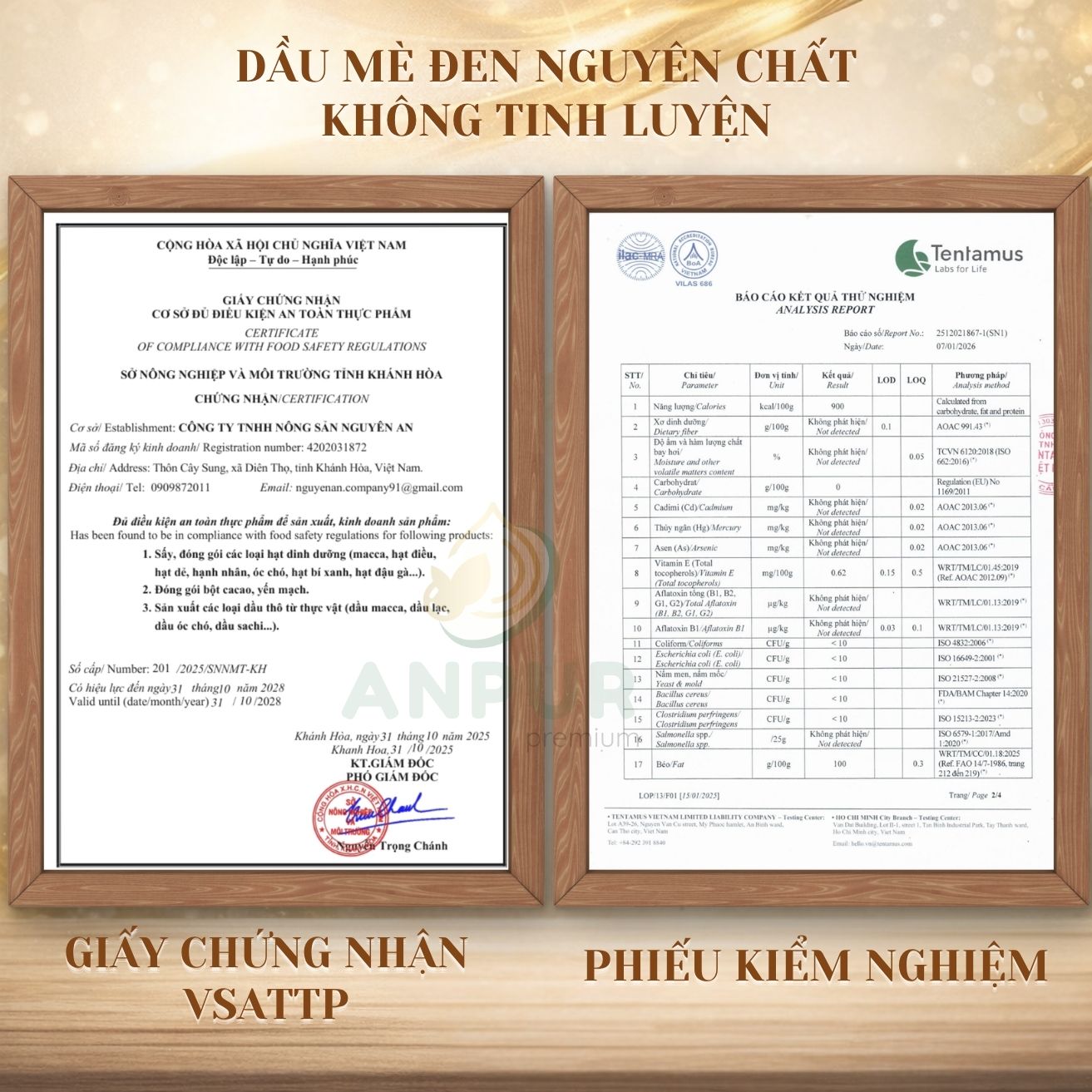 Dầu Mè đen nguyên chất ANPUR được kiểm định bởi phòng Kiểm nghiệm đạt chuẩn, theo các chỉ tiêu kim loại nặng, vi sinh vật, nấm, độc tố và các chỉ tiêu hóa lý, dinh dưỡng theo tiêu chuẩn an toàn thực phẩm.