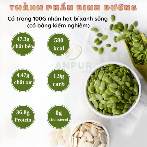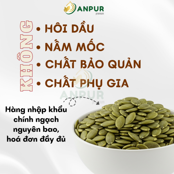 Nhân hạt bí xanh sống đã tách vỏ ANPUR được nhập khẩu nguyên bao từ Ấn Độ, đã được diệt khuẩn và sấy khô. Hàng loại 1 chất lượng cao, hạt đều size, chắc mẩy đảm bảo không hôi dầu, không nấm mốc, không chất bảo quản.