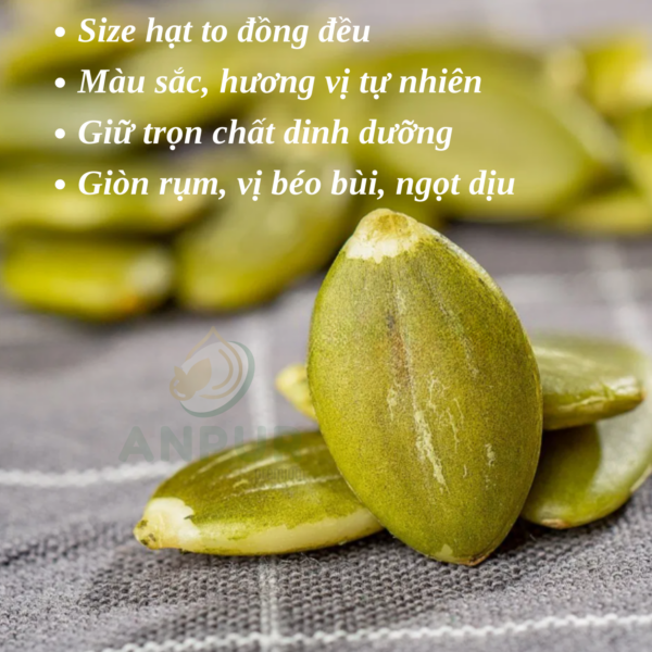 Hạt bí xanh sấy mộc nguyên vị ANPUR được sấy mới liên tục tại xưởng, đảm bảo sản phẩm tươi ngon, không hôi dầu. Nguyên liệu hạt bí xanh sống được nhập khẩu chính ngạch, hạt đầy đặn, mập mạp.