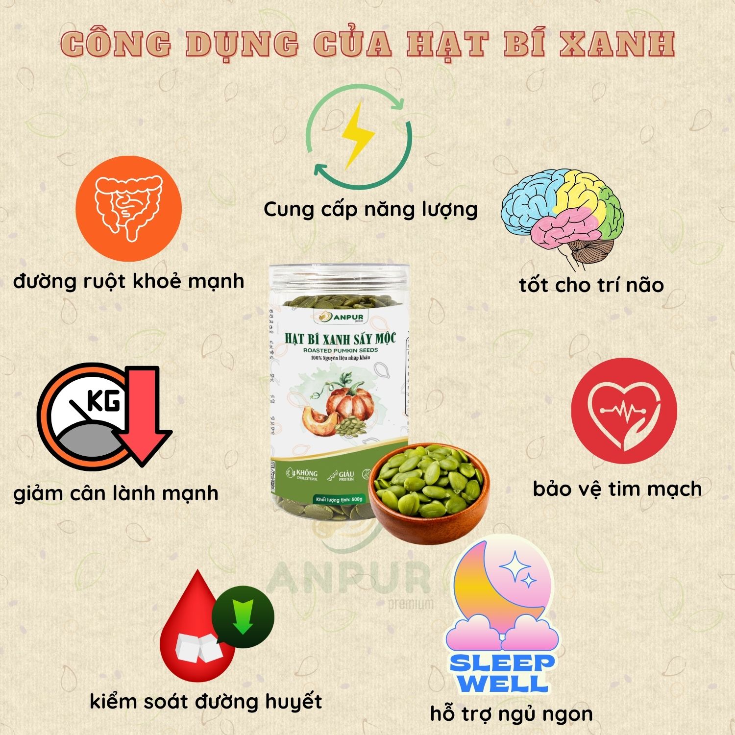 – Tốt cho trí não và hệ thần kinh, cải thiện chất lượng giấc ngủ: Magie và các chất khoáng trong hạt bí xanh giúp hỗ trợ chức năng thần kinh, giảm căng thẳng, cải thiện trạng thái tinh thần, hỗ trợ ngủ ngon và sâu giấc hơn.