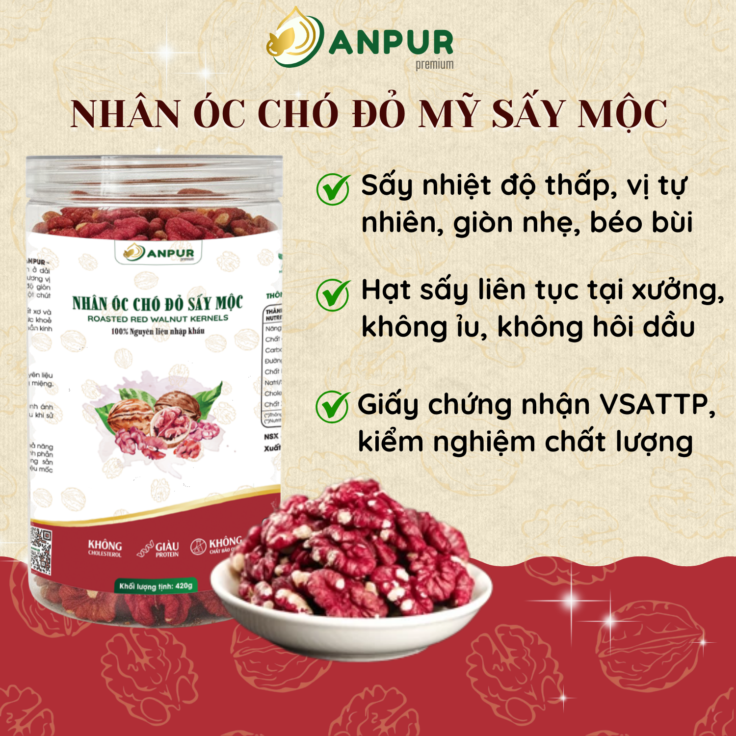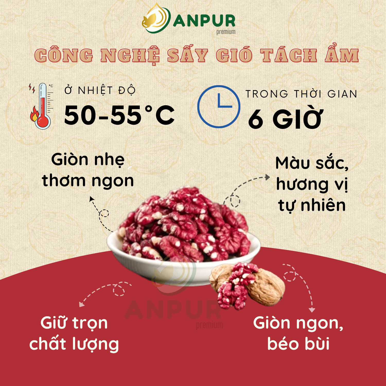 – Hạt được sấy mới tại xưởng mỗi ngày, đảm bảo sản phẩm tươi ngon, không hôi dầu. Với công nghệ sấy gió nóng tách ẩm ở dải nhiệt độ 50-55°C trong thời gian 6 giờ đồng hồ, nhân hạt óc chó ANPUR giữ trọn vẹn màu sắc, hương vị tự nhiên và giá trị dinh dưỡng, mang đến hương vị béo bùi và một chút vị đắng nhẹ tự nhiên ở đầu lưỡi.