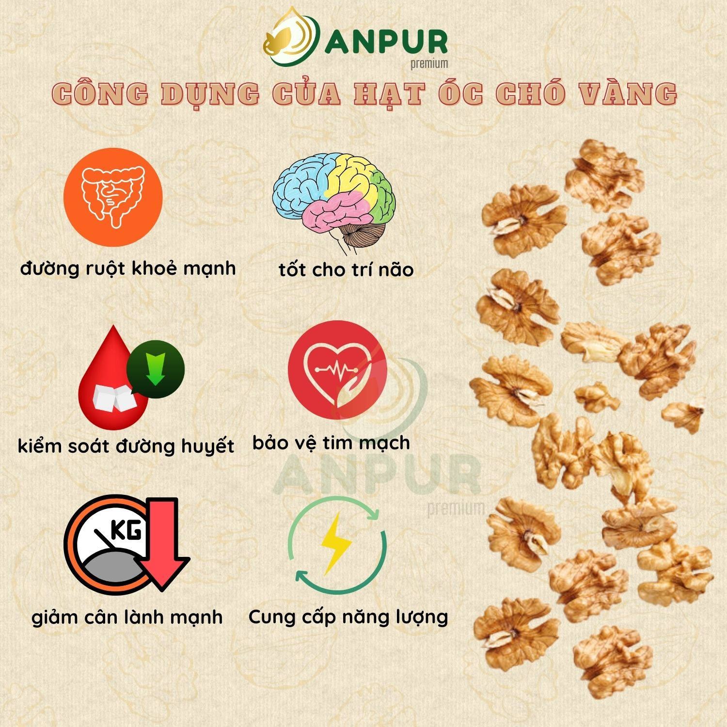 Hạt óc chó vàng sấy mộc ANPUR được nhập khẩu chính ngạch từ Mỹ/Chile (Tuỳ mùa vụ), với hạt đầy đặn, mập mạp, đã được sấy khô diệt khuẩn.