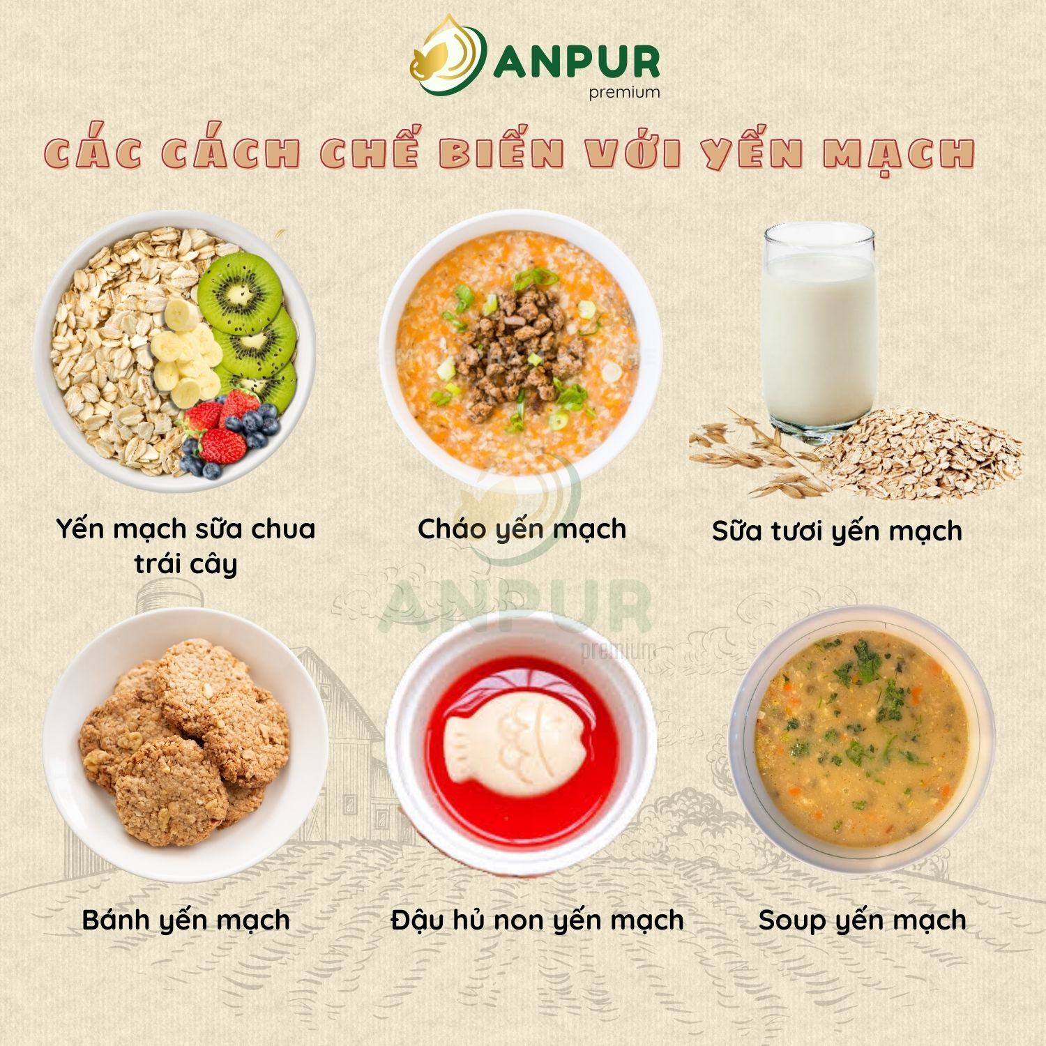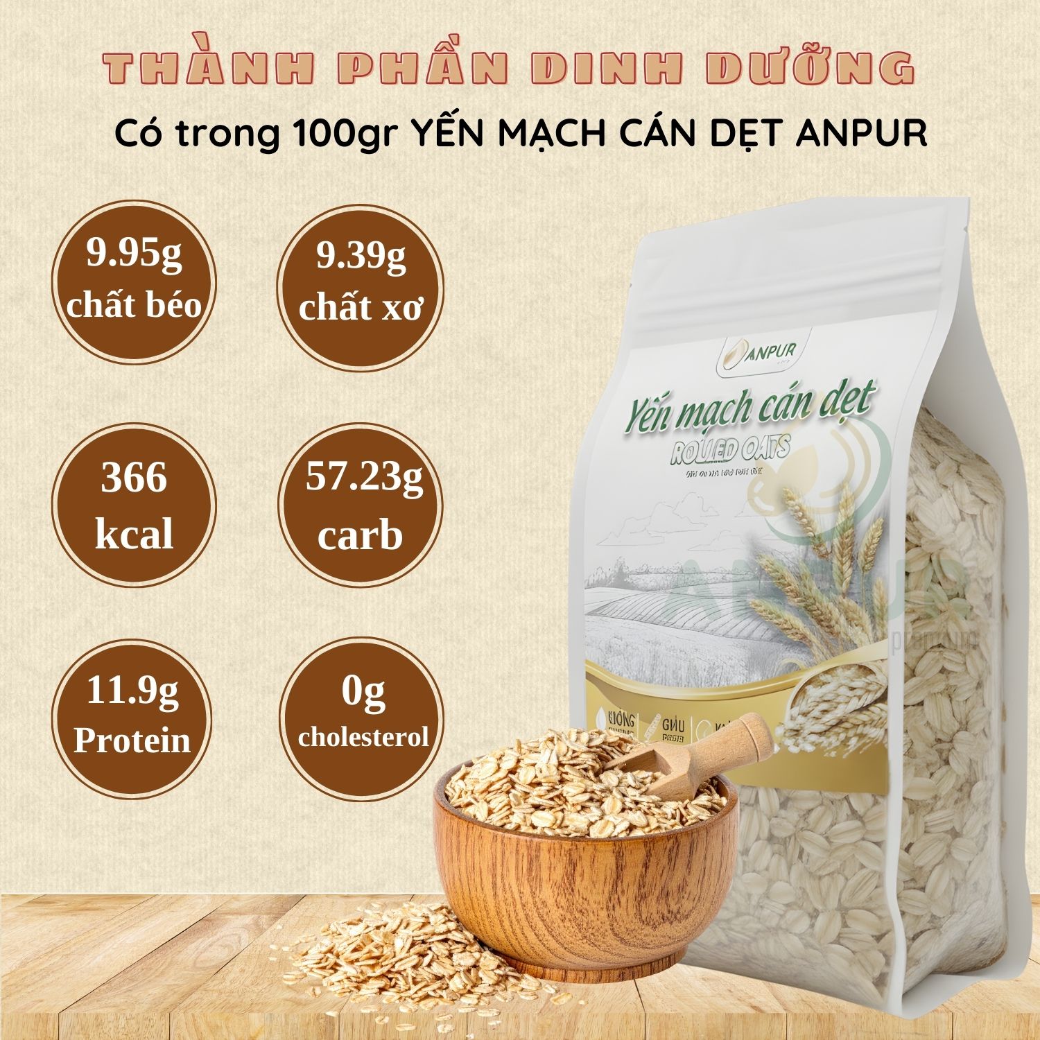 – Yến mạch cán dẹt ANPUR được làm từ 100% hạt yến mạch nguyên chất, có hương vị tự nhiên, ngọt nhẹ. Hạt yến mạch được hấp chín và cán mỏng 0.88mm, giúp kết cấu mềm, dẻo, nhanh mềm khi nấu, thích hợp để nấu cháo, nấu sữa, làm granola, ngũ cốc….